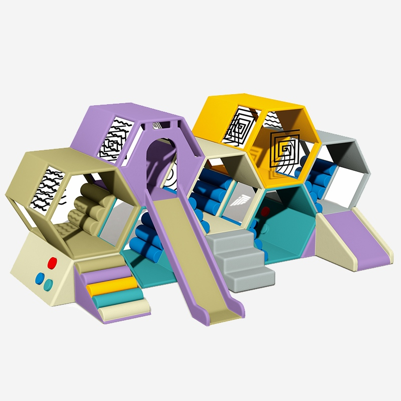 This Hexagon Hive indoor soft play equipment is a themed modular soft play climber for kids. Its hexagonal hive-shaped modules integrate climbing sections, slides, and sensory decorative elements (patterned panels, tactile pads), blending active play with sensory exploration.
