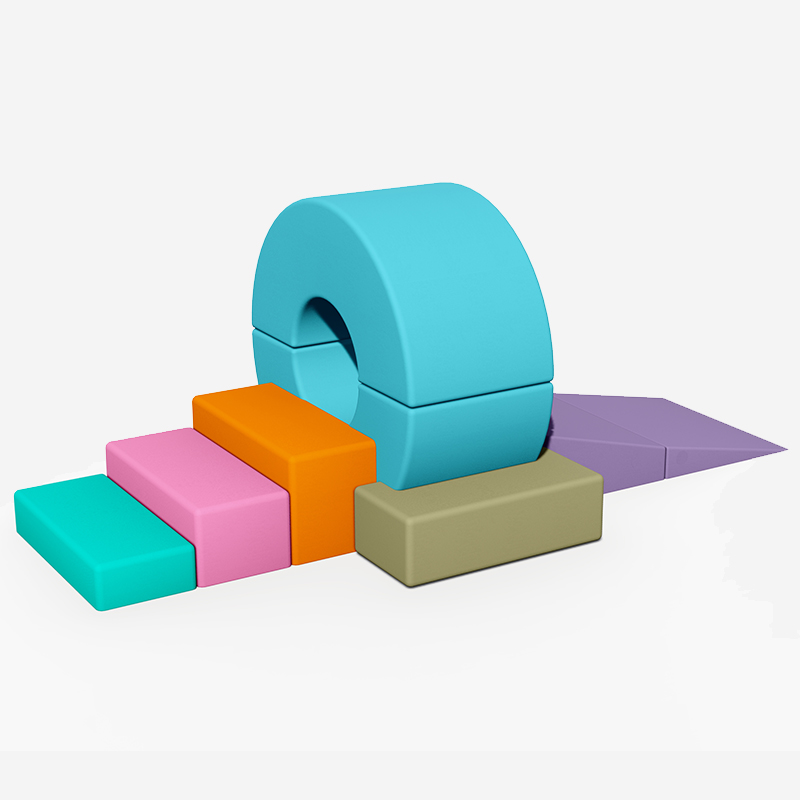 Components: Curved soft arc modules, stepped soft blocks, sloped soft ramps, interlocking connection pieces